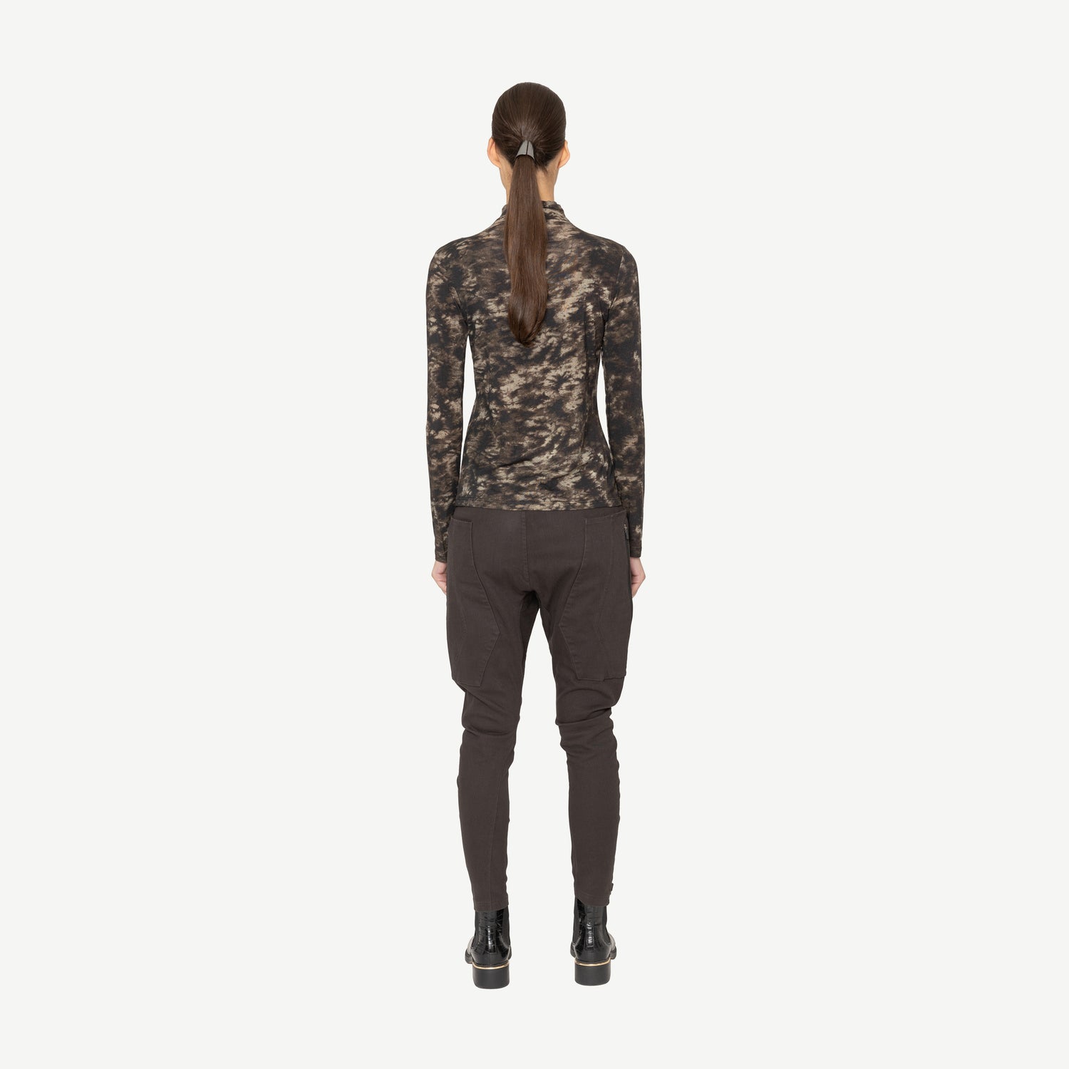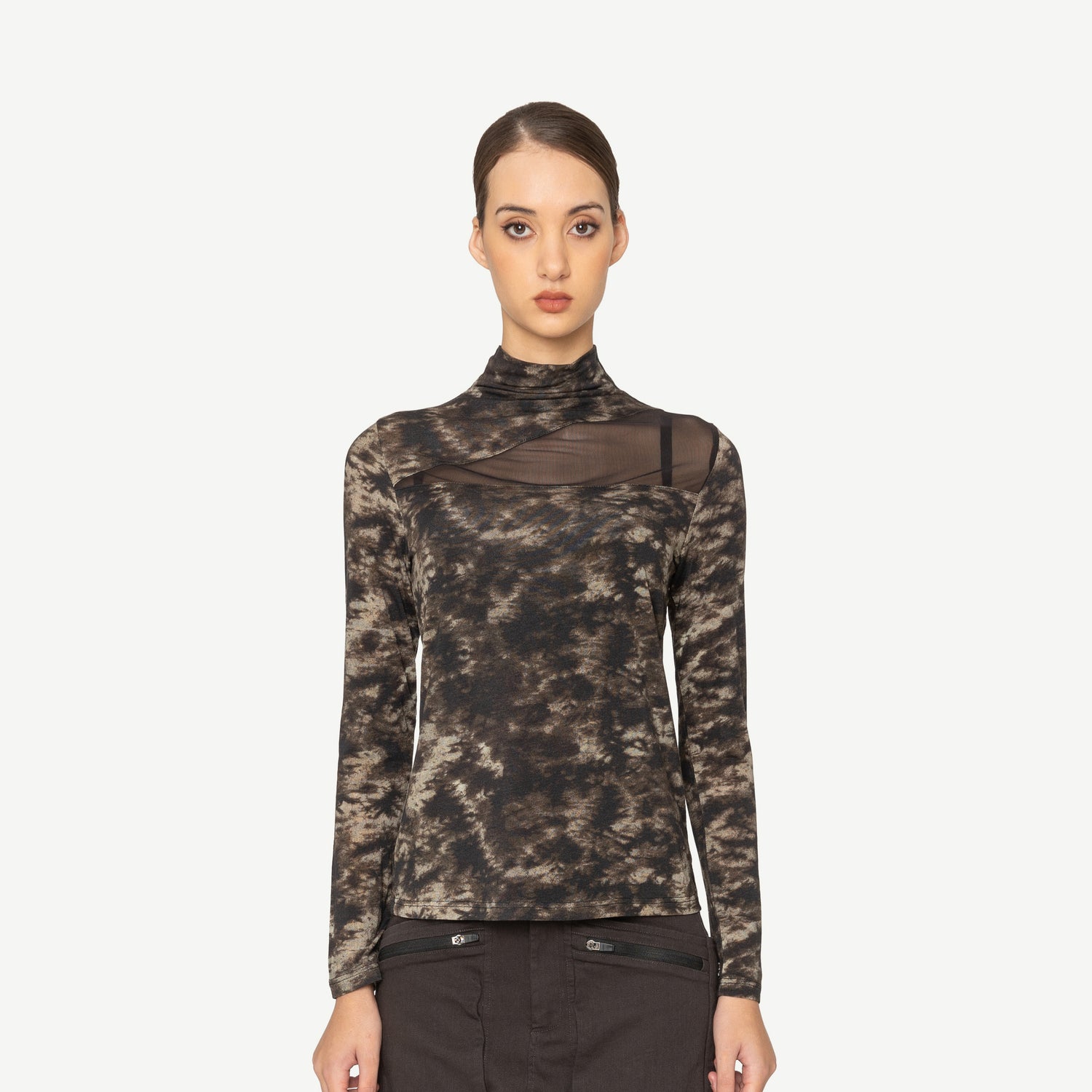The Yoro Top boldly combines a two-toned print with a sheer asymmetrical front panel for a striking look. Its fitted shape and high neck create a sleek silhouette, perfect for making a statement that turns heads wherever you go.